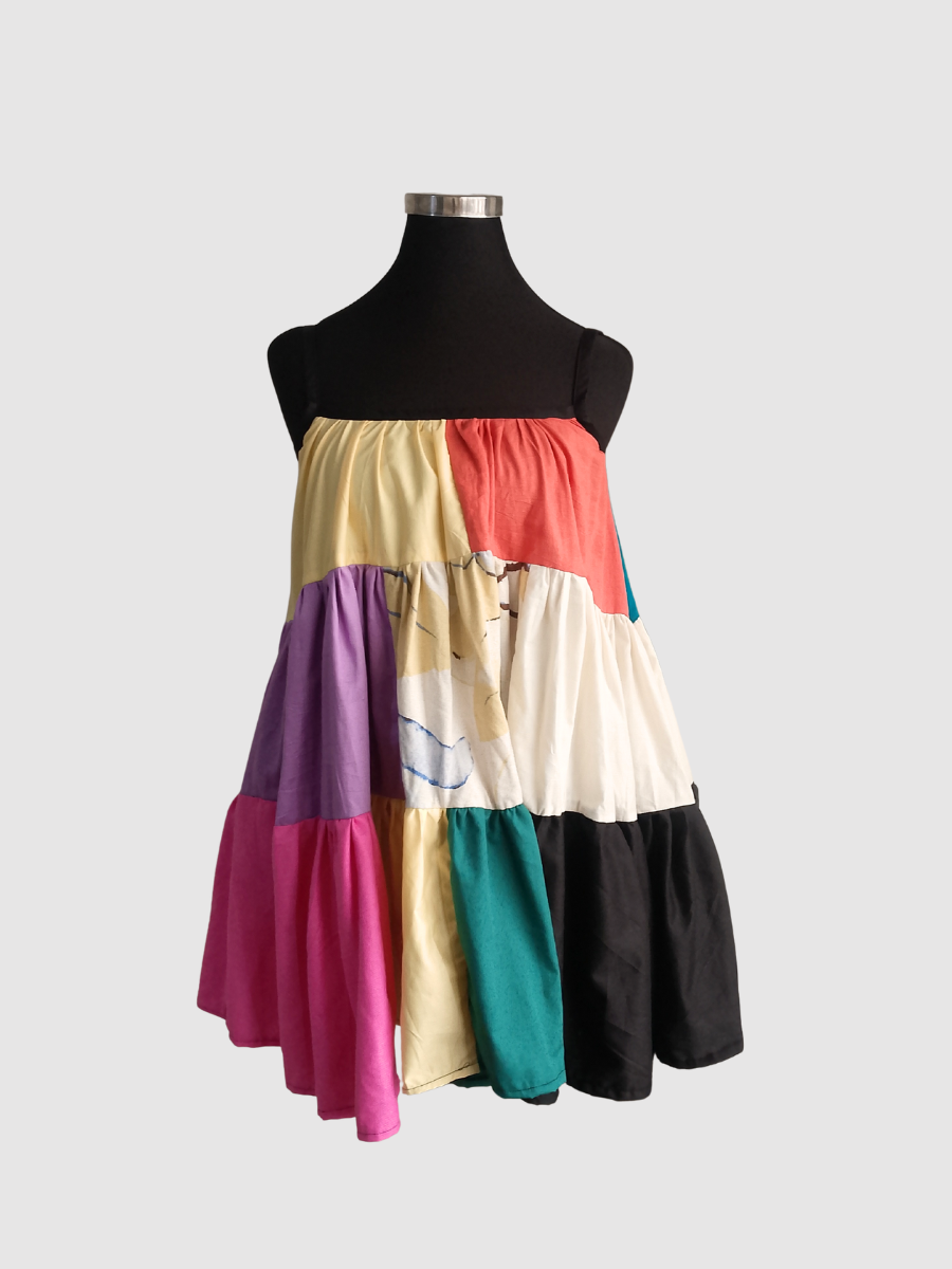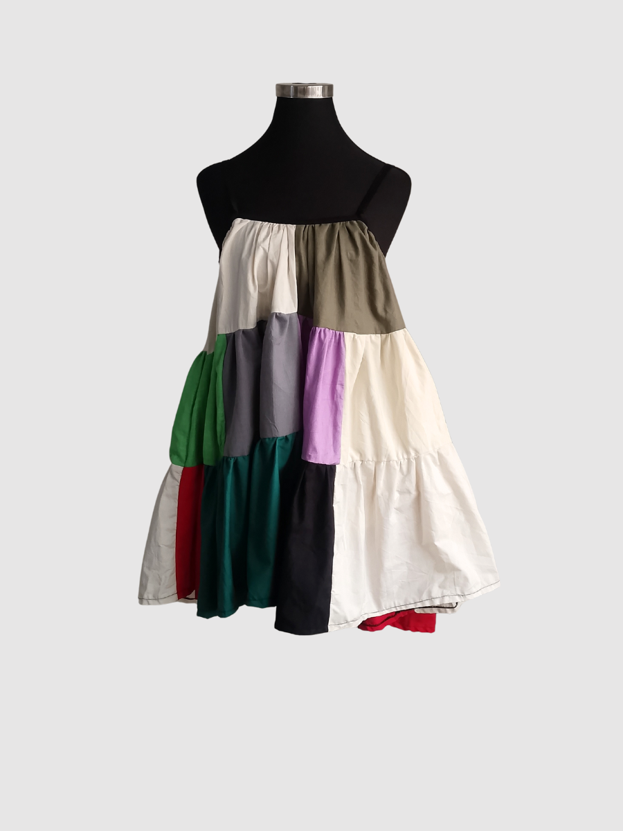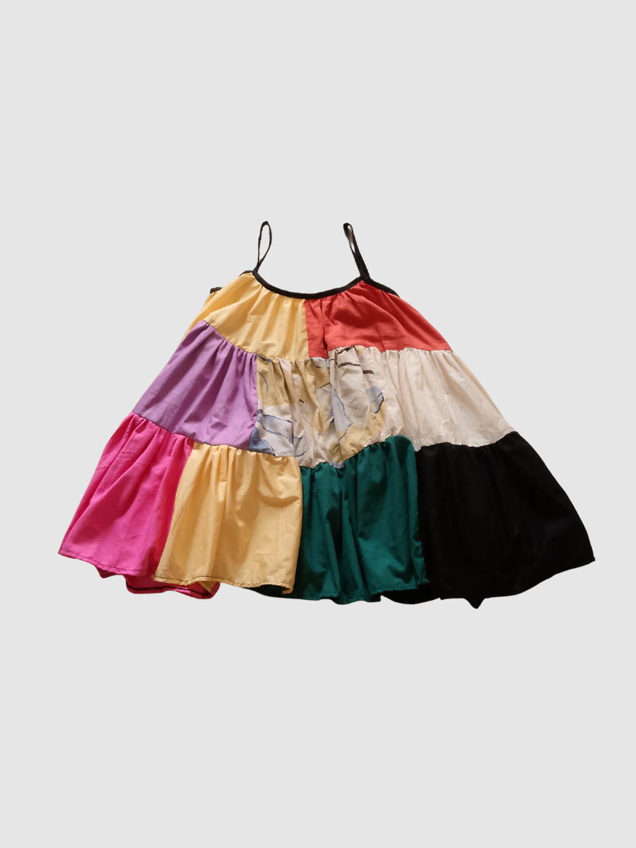 Full flared dress made from off-cut fabrics with pockets.