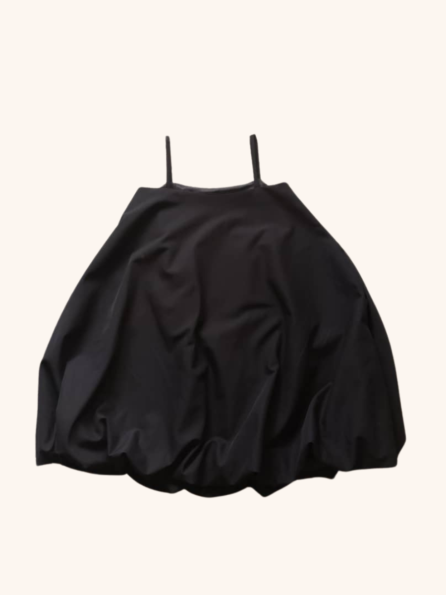 Description: minimalist A-line silhouette, balloon-shaped hem. Fabric is Crepe, straps are with same fabric (not elastic like the original, it’s also not as voluminous)