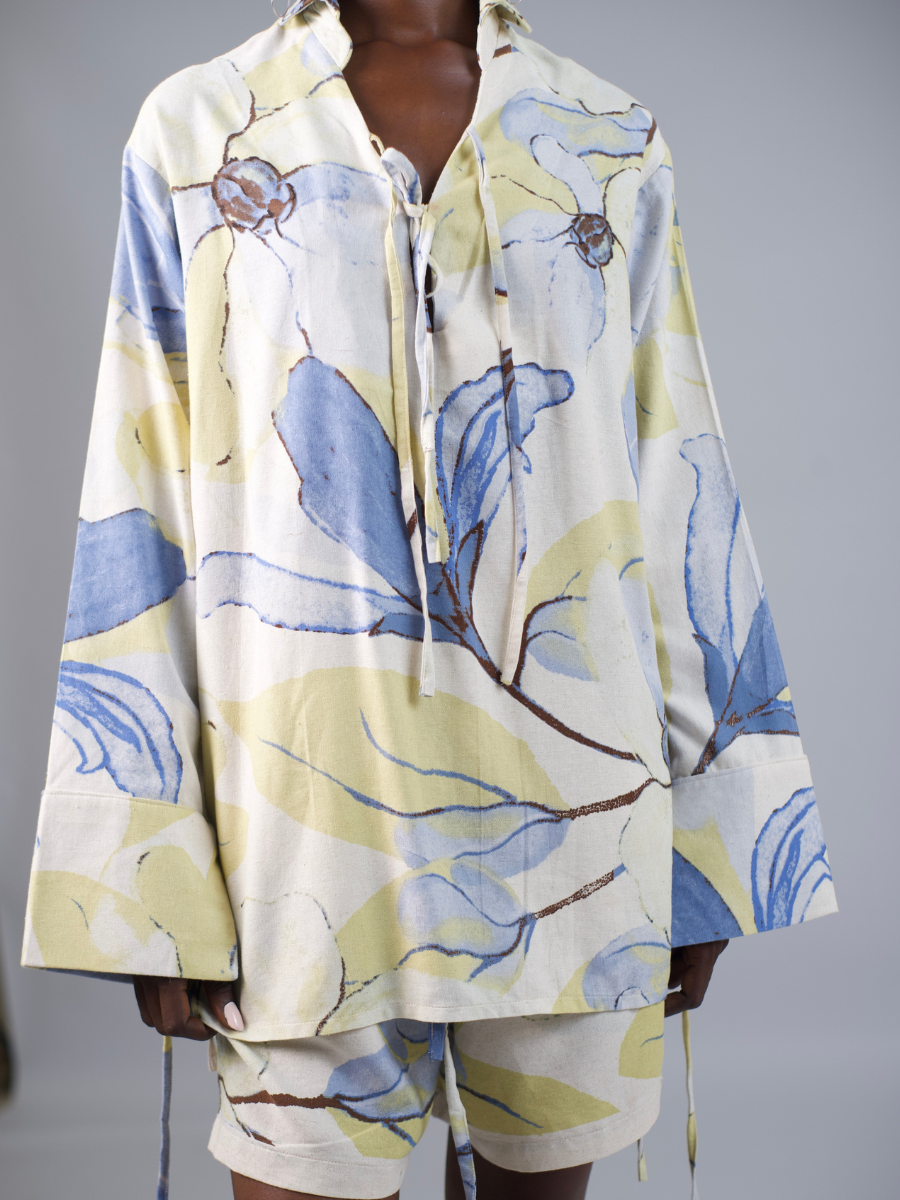 Floral Breeze Blouse is an elevated take on a chilled tunic. This airy blouse features cuffed sleeves, a tie-front detail, and a soft collar for a touch of structure. Light and easy.