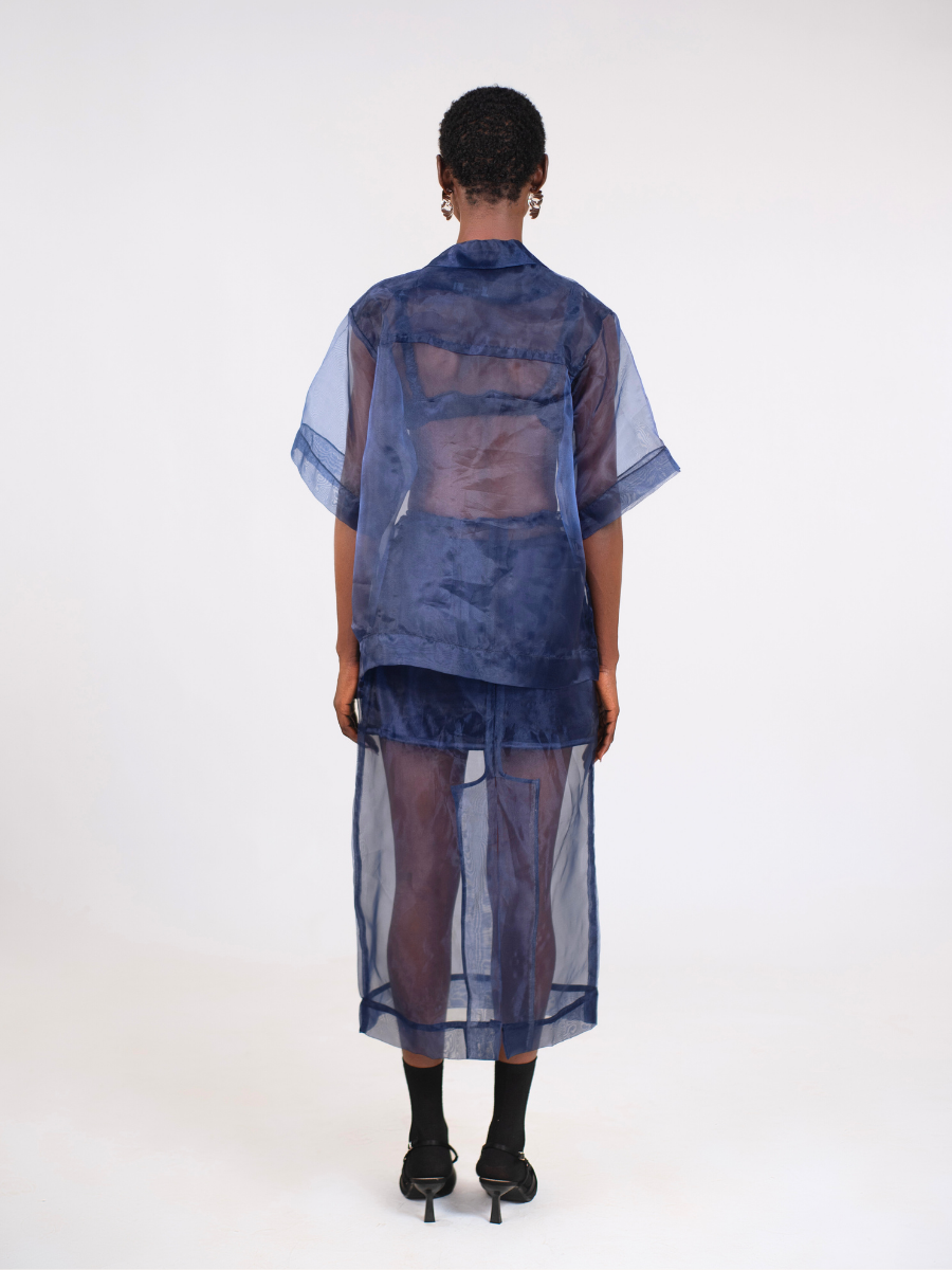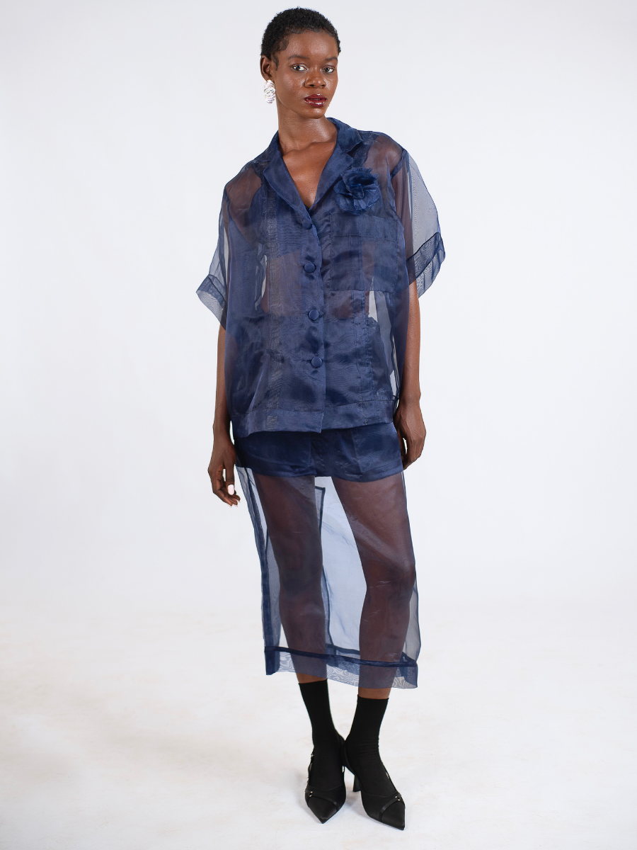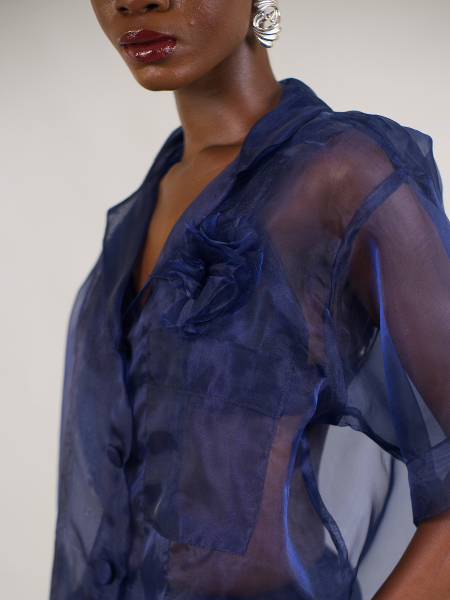 Introducing the Rose Detail Blouse. We love an airy, lightweight piece. We’ve balanced the sheer, feminine texture with a boxy, structured shape. This blouse features a delicate rose applique at the chest. It can be Paired here with it’s matching organza straight skirt, the look is equal parts crisp and ethereal.